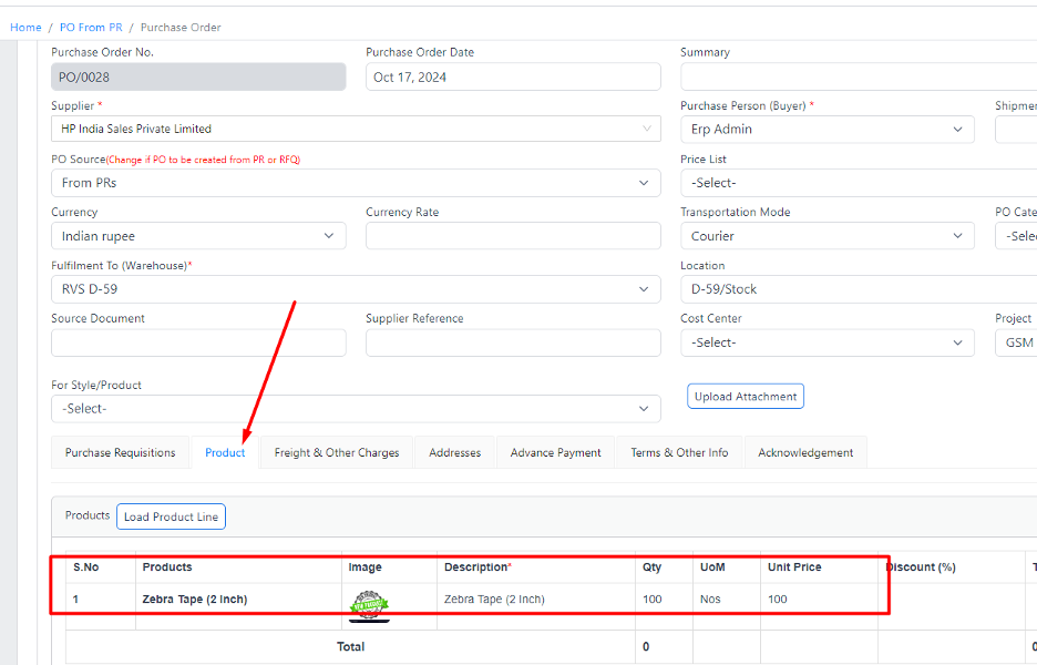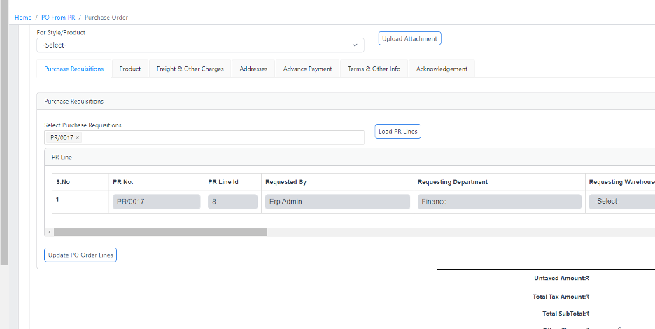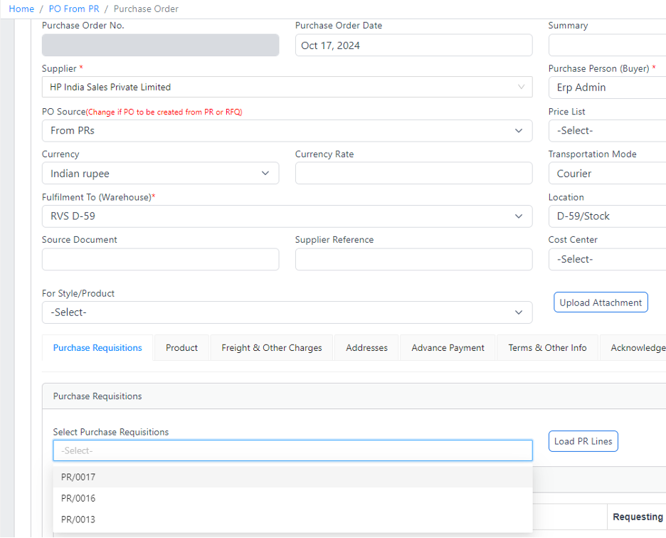 - Click Load PR Lines to auto-fill the product lines from the requisition.