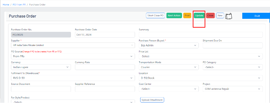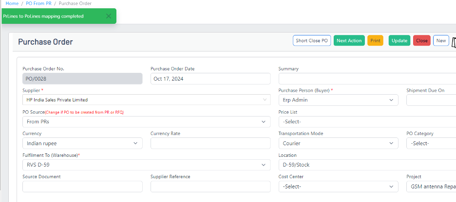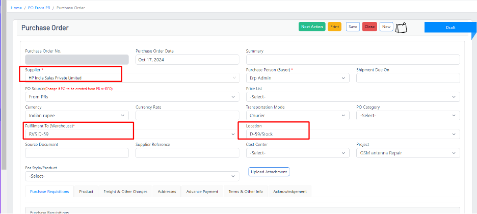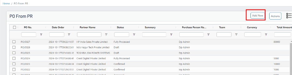 - Navigate to Purchase → Purchase Order → PO from PR → Add New.