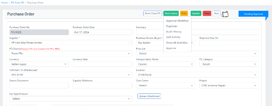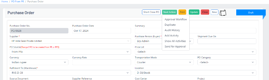 When the PO is ready, click Next Action → Send for Approval to commence the configured approval workflow.