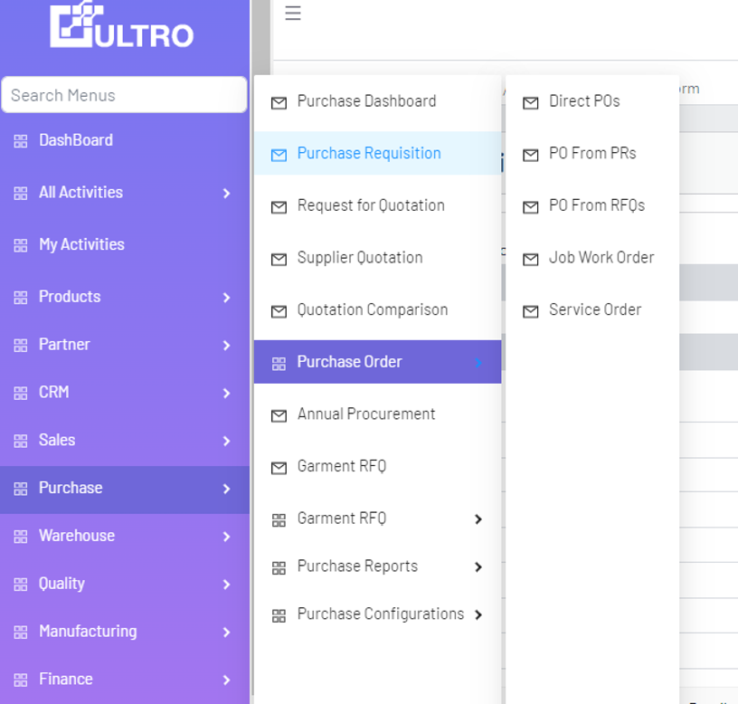 This page explains how to create and manage Purchase Orders (POs) in Ultro ERP. A PO is the formal agreement with a supplier and is typically created after a Purchase Requisition (PR) is approved or after comparing supplier quotations.