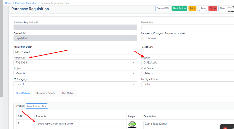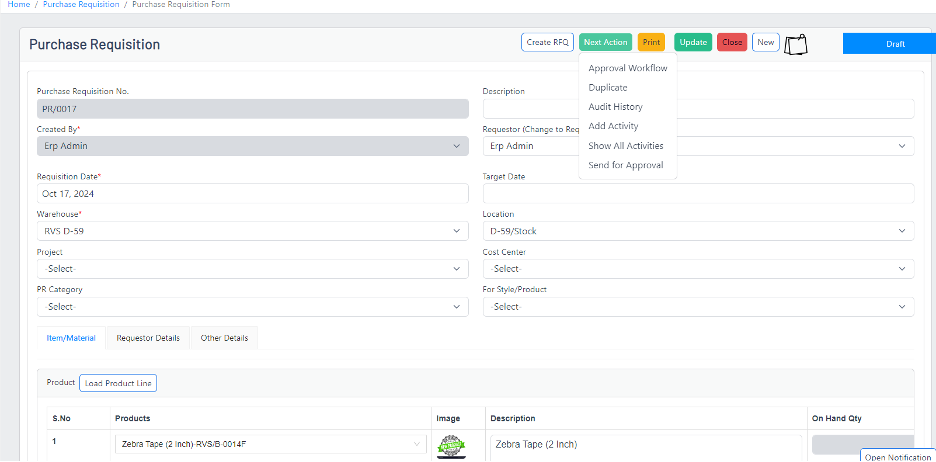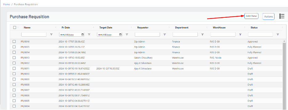 - Navigate to Purchase → Purchase Requisition → Add New.
