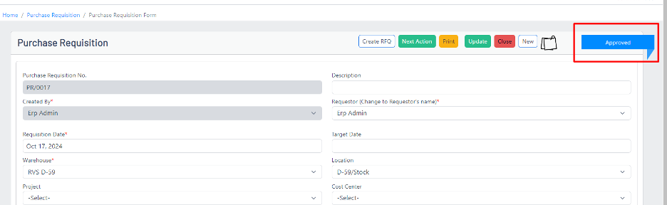 - Approved — The approver has approved the PR and it is now ready to be converted to an RFQ or Purchase Order.